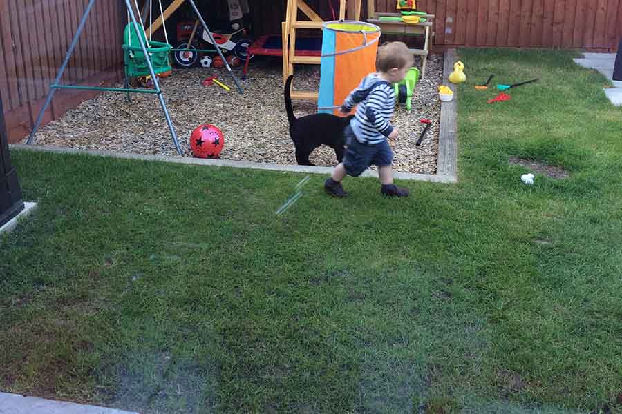 One of the biggest things for me was how the weather took its toll on the garden. It was just a complete mud bath for a large part of the year, looked awful and was totally unusable – as much as our son wanted to go out and play, he just couldn’t. And with four cats coming and going, you can imagine the effect 16 muddy paw prints had on the house – I was constantly mopping the kitchen floor and wiping the sides down. Having the cats played a huge part in our decision. After acquiring two kittens last summer, some had also taken to using the turf as a toilet, which no matter how meticulous you are about cleaning up, doesn’t make a safe environment for a child to play. I knew that with fake grass you could simply hose, brush it off and disinfect, and many friends had chosen artificial grass for dogs and other pets.